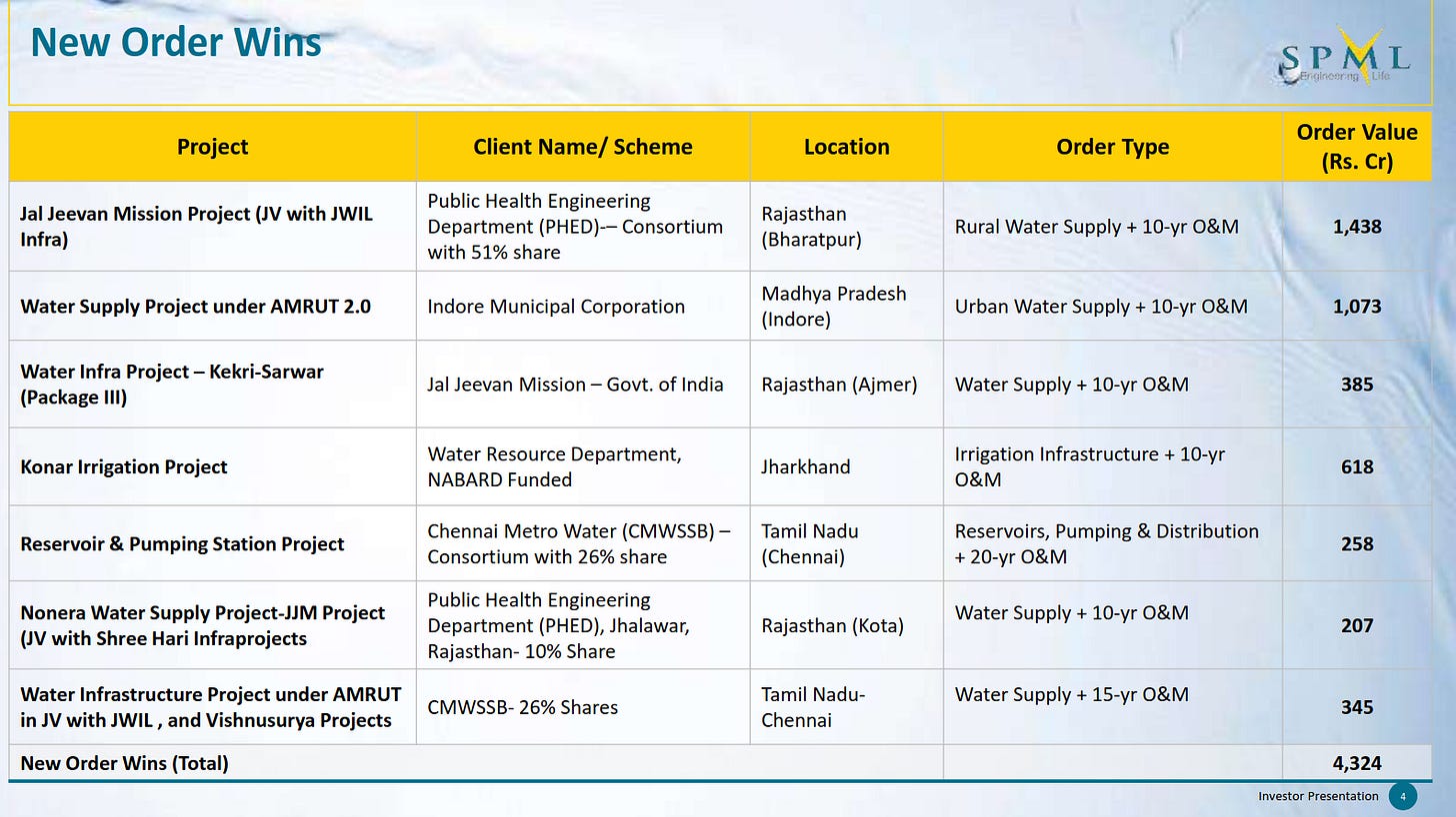 SPML secured new orders worth ₹4,324 crore across water supply and irrigation projects, largely under Jal Jeevan Mission and AMRUT 2.0.