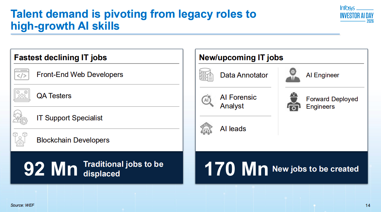 Legacy IT roles such as front-end developers, QA testers, and IT support are declining, with ~92 million traditional jobs expected to be displaced. At the same time, 170 million new roles—such as AI engineers, data annotators, AI forensic analysts, and forward-deployed engineers—are projected to emerge, signaling a major skills transition.