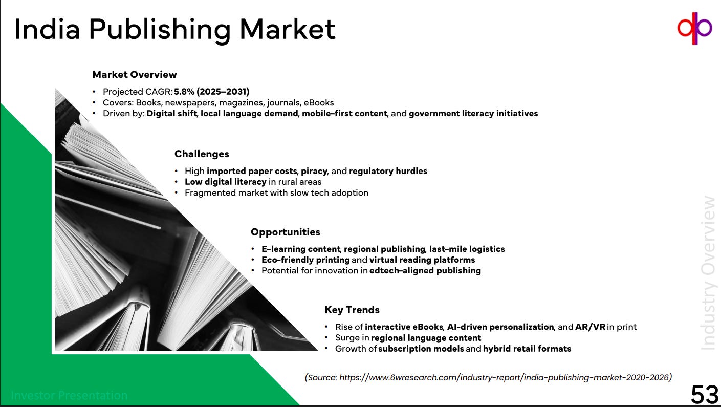 The Indian publishing market is projected to grow at a 5.8% CAGR (2025–2031), driven by digital adoption, regional language demand, and government literacy initiatives. While high paper costs, piracy, and low rural digital literacy remain challenges, opportunities lie in e-learning, edtech-aligned publishing, and subscription-based models. Trends include interactive eBooks, AI-driven personalization, and hybrid retail formats.