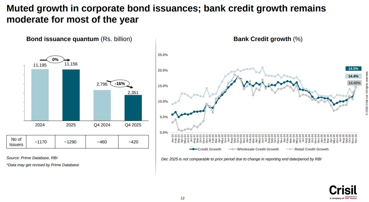 Corporate bond issuances have stayed flat, moving from Rs. 11,195 billion in 2024 to Rs. 11,156 billion in 2025, with the number of issuers dropping from around 1,170 to 1,290. On a quarterly basis, Q4 2025 saw bond issuances decline 16% to Rs. 2,351 billion compared to Q4 2024. Bank credit growth has remained moderate through most of the year, hovering in the 10-12% range before picking up slightly to 14.5% by late 2025. Overall credit growth shows a similar pattern, indicating that companies are neither aggressively borrowing from banks nor significantly tapping the bond market.