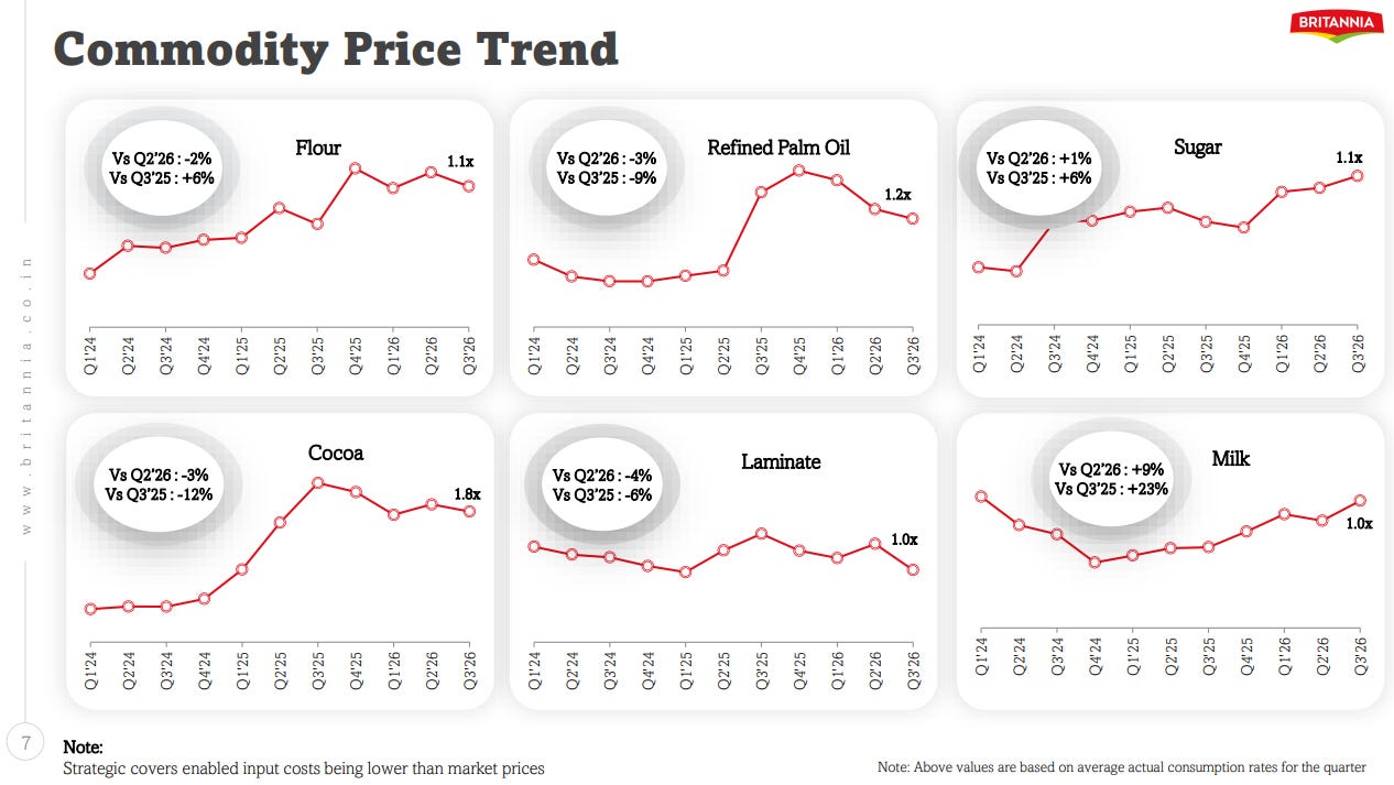 Britannia tracks prices for six key raw materials that go into their products. Flour is down 2% versus the previous quarter but up 6% year-on-year, while refined palm oil has dropped 3% and 9% respectively. Sugar and milk have seen price increases, with milk jumping 9% compared to last quarter and 23% year-on-year. The company notes that strategic procurement deals have helped them lock in costs below prevailing market rates, giving them some buffer against commodity inflation.