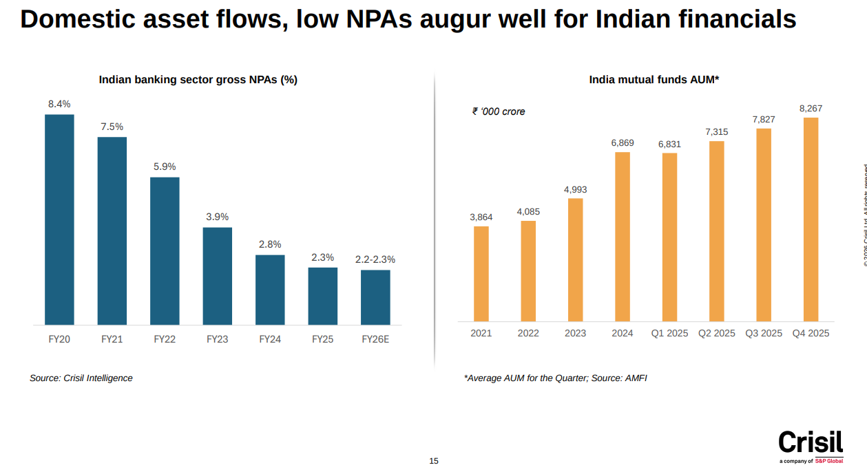Indian banks have seen their gross NPAs drop steadily from 8.4% in FY20 to an estimated 2.2-2.3% in FY26, indicating much healthier loan books and better asset quality. At the same time, mutual fund assets under management have more than doubled from Rs. 3,864 crore in 2021 to Rs. 8,267 crore by Q4 2025. This shows strong domestic savings flowing into the financial system through mutual funds, while banks are dealing with cleaner balance sheets. Together, these trends point to a robust environment for Indian financial institutions with more capital available and fewer bad loans to worry about.