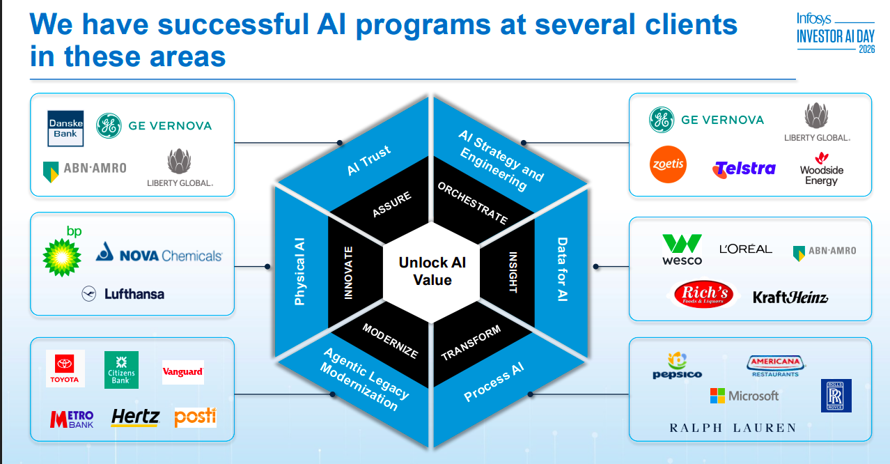Infosys highlights enterprise AI engagements spanning AI Trust, AI Strategy & Engineering, Data for AI, Process AI, and modernization. The slide showcases broad client adoption across industries, demonstrating end-to-end AI value unlock capabilities.