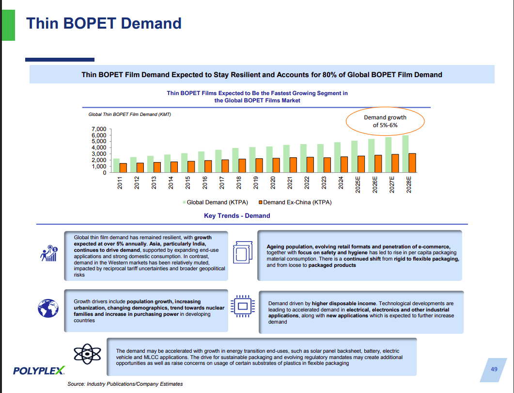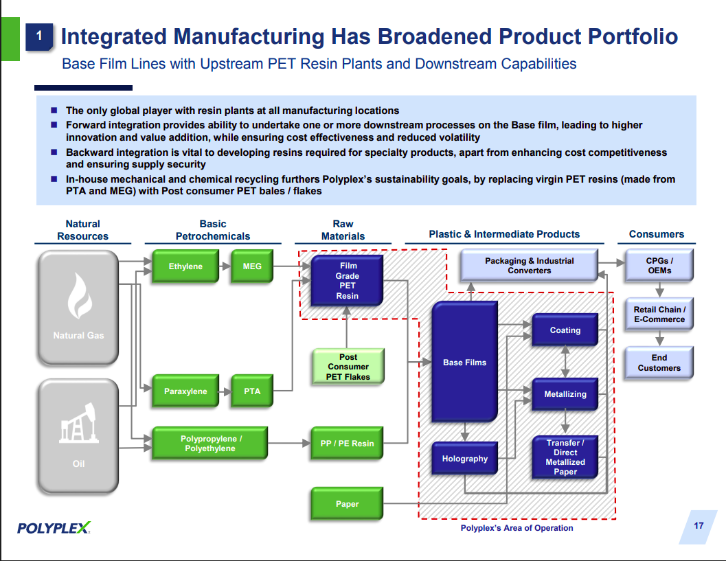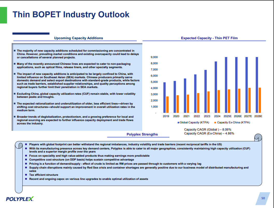 Polyplex’s backward integration—from PET resin to base films and downstream value-added products—enhances cost control, supply security, and innovation. In-house recycling and diversified end-use exposure strengthen margins and reduce volatility across cycles.