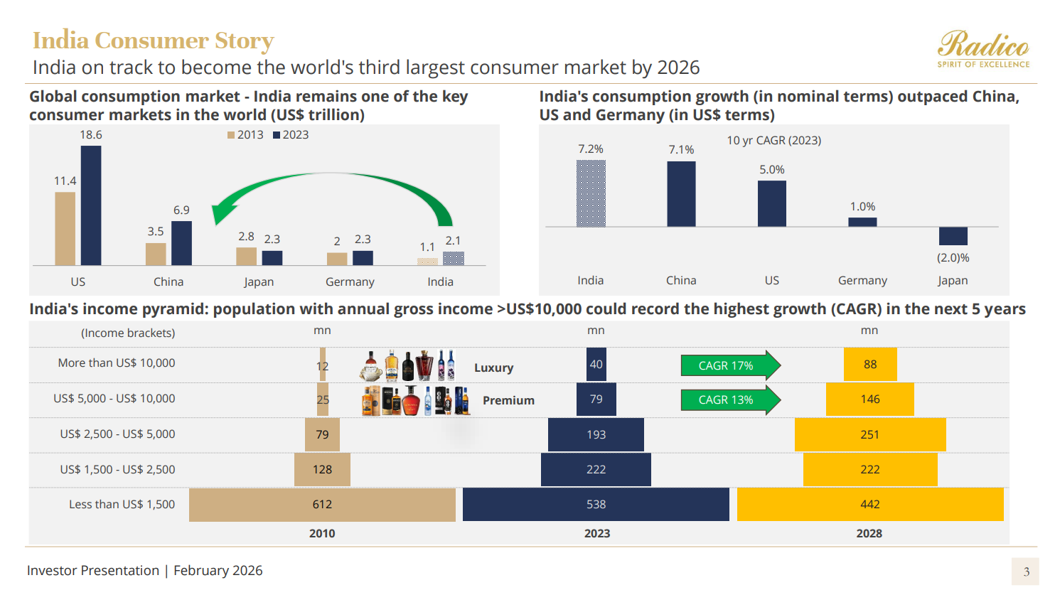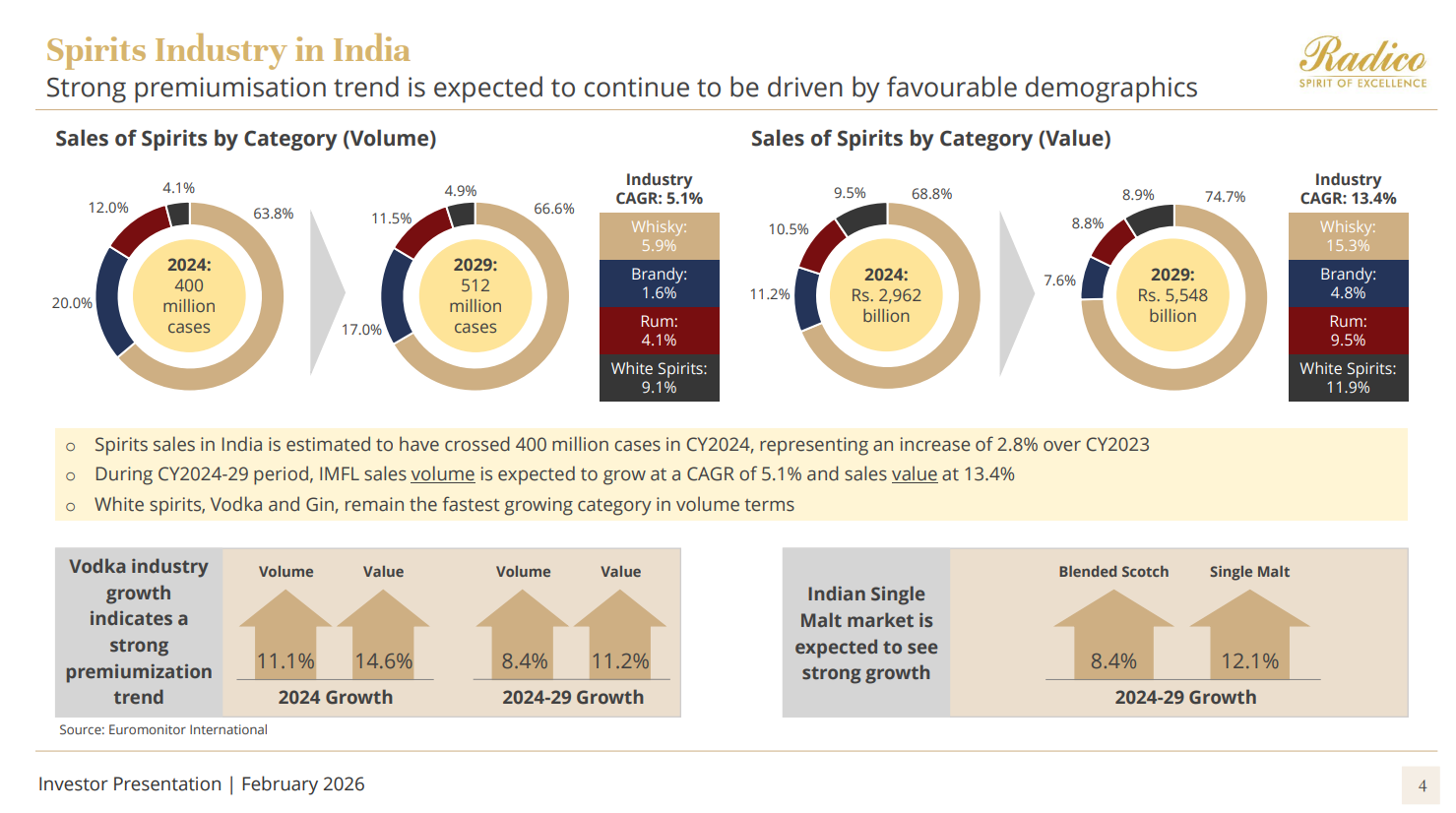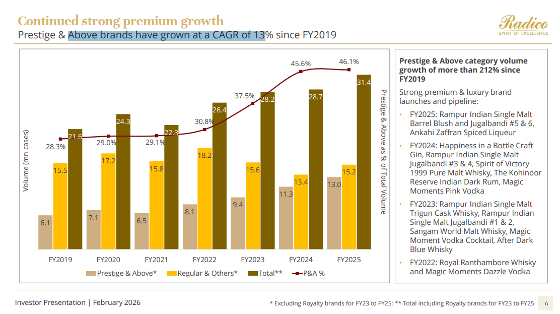 Radico Khaitan’s prestige and above portfolio has been growing at 13% annually since 2019, significantly outpacing their regular brands. The premium segment’s share of total volume has jumped from 28.3% in FY2019 to 46.1% in FY2025, now accounting for nearly half of all sales. The company has been consistently launching new premium and luxury products, including Indian single malts like Rampur, craft spirits, and premium vodkas across recent years. This shift towards higher-priced products explains why the company is seeing stronger value growth compared to volume growth in the overall spirits market.