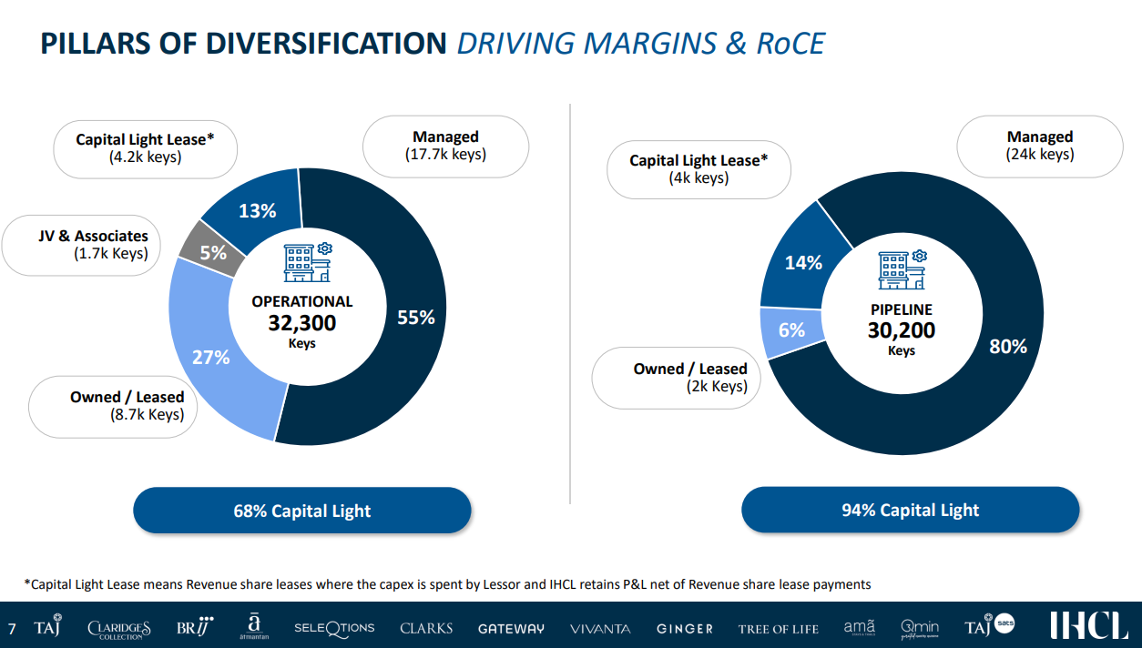 Indian Hotels operates a mix of owned and asset-light models to drive margins and returns. Of the 32,300 operational keys, 55% are managed properties, 27% are owned or leased, 13% are capital light leases, and 5% are joint ventures, making 68% of the portfolio capital light overall. In the pipeline of 30,200 keys under development, the asset-light share is even higher at 94%, with 80% being managed properties and 14% being capital light leases. This shift towards managing properties rather than owning them means the company can grow its footprint without tying up large amounts of capital, leading to better returns on invested capital.