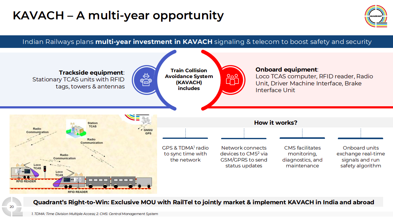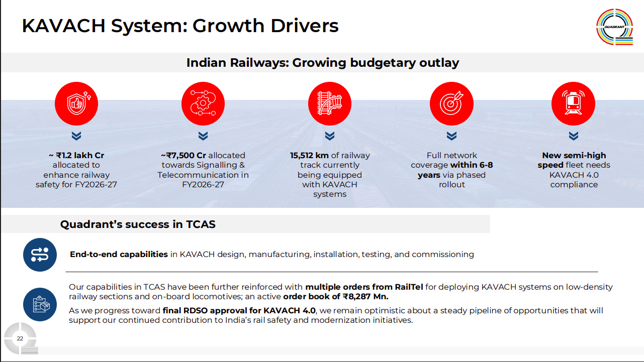 Quadrant is positioned to benefit from rising government spending on Indian Railways, Make-in-India initiatives, increasing focus on transportation safety, and adoption of advanced technologies like AI.