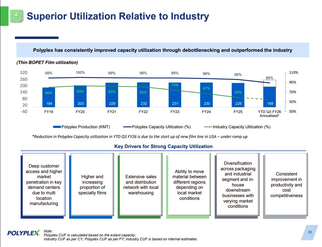 Polyplex consistently maintained high capacity utilization (~96–100%) compared to industry averages, even during cyclical downturns. Multi-location manufacturing, specialty mix, strong distribution, and productivity gains support sustained CUF leadership.