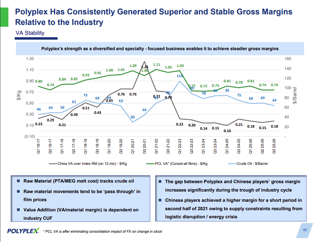 Polyplex has delivered more stable and superior value-added margins versus industry peers, supported by specialty focus and diversified operations. Margin volatility in Chinese players widened during downcycles, highlighting Polyplex’s resilience.