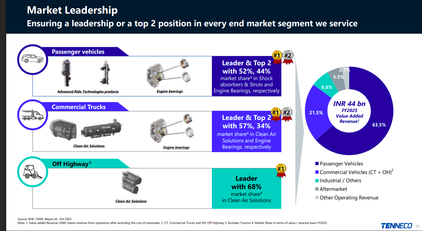 Tenneco holds leadership or top-two positions across key segments—passenger vehicles, commercial trucks, and off-highway—with dominant market shares in clean air solutions and engine bearings. FY25 value-added revenue stands at ₹44 bn, largely driven by passenger vehicles (63.5%).