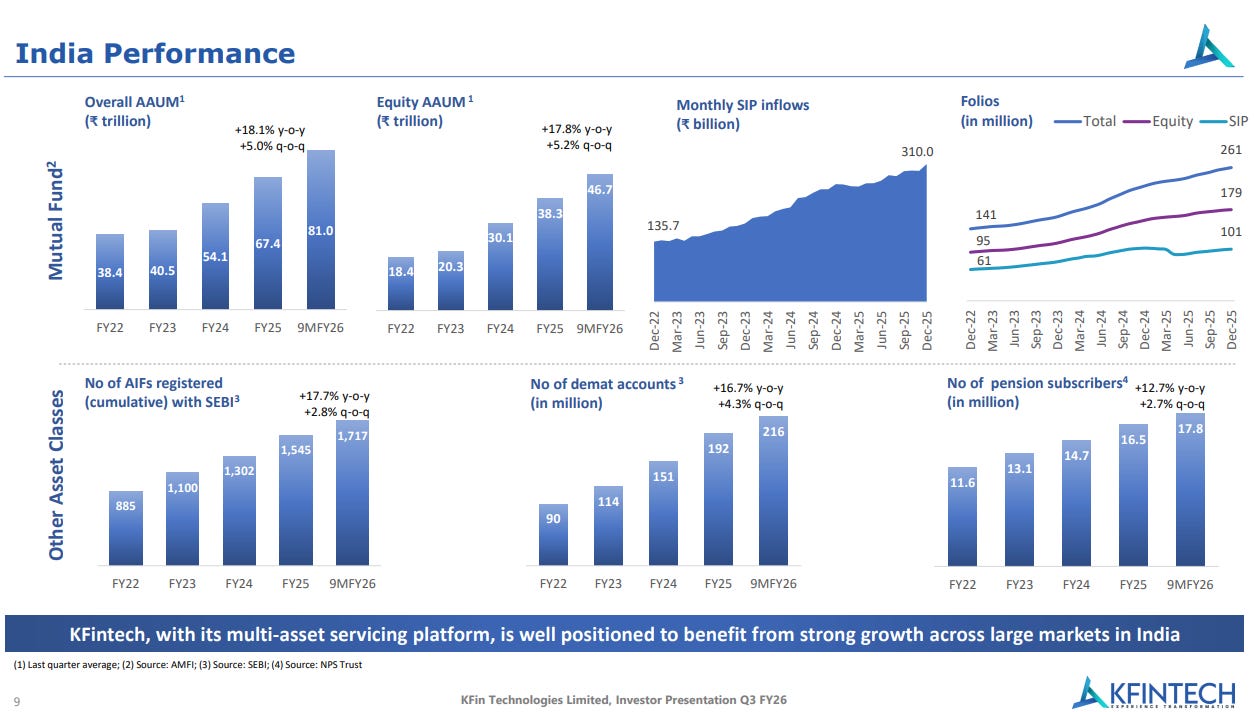 KFin Technologies has seen strong growth across all metrics in India’s mutual fund and financial services sector. Overall assets under management and unit services have grown 18.1% year-on-year to Rs. 81 trillion, while equity assets have jumped 17.8% to Rs. 46.7 trillion. Monthly SIP inflows have surged to Rs. 310 billion in December 2025, with total folios reaching 261 million, equity folios at 179 million, and SIP folios at 101 million. The number of registered alternative investment funds has grown to 1,717, demat accounts to 216 million, and pension subscribers to 17.8 million. KFin’s multi-asset servicing platform positions it well to benefit from this broad-based expansion across large markets in India.