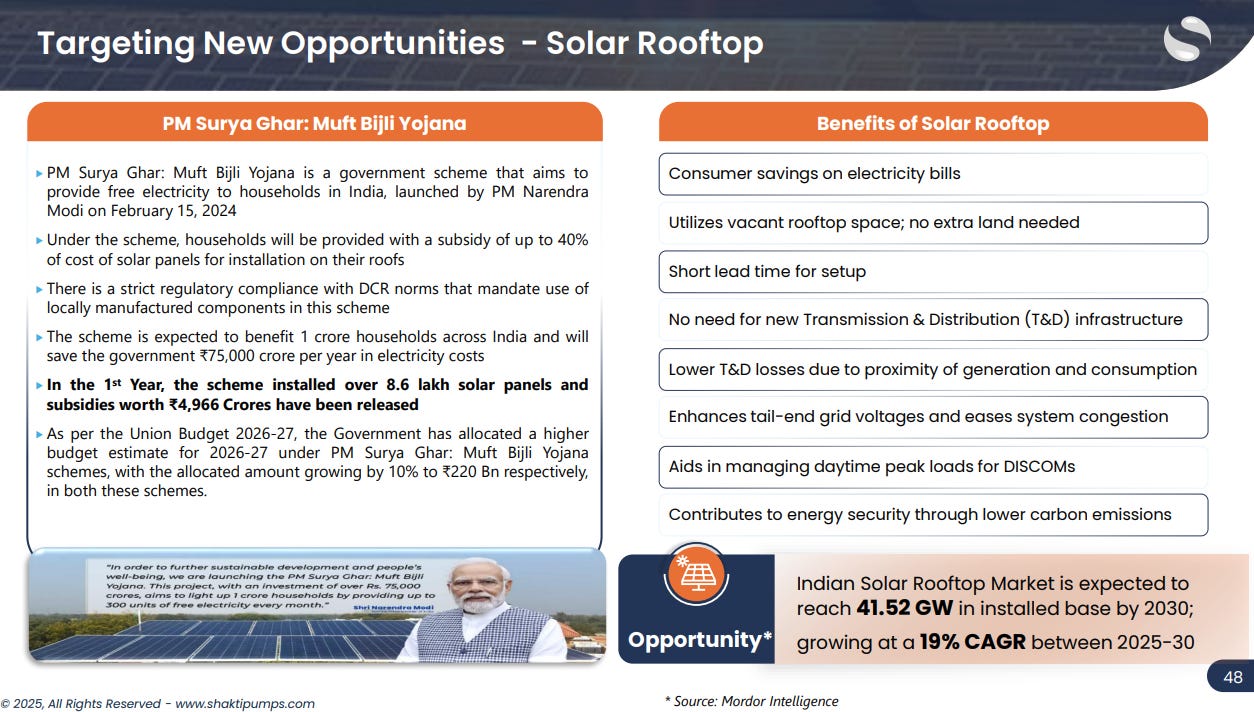 The PM Surya Ghar Muft Bijli Yojana launched in February 2024 offers households a subsidy of up to 40% for installing solar panels on their roofs. In its first year, the scheme installed over 8.6 lakh solar panels and released subsidies worth Rs. 4,966 crores, with the budget allocation increasing by 10% to Rs. 220 billion for 2026-27. Solar rooftops bring multiple benefits including savings on electricity bills, no need for extra land or transmission infrastructure, lower distribution losses, and better grid management during peak hours. The Indian solar rooftop market is expected to reach 41.52 GW by 2030, growing at 19% annually between 2025-30, presenting a significant opportunity for companies in this space.
