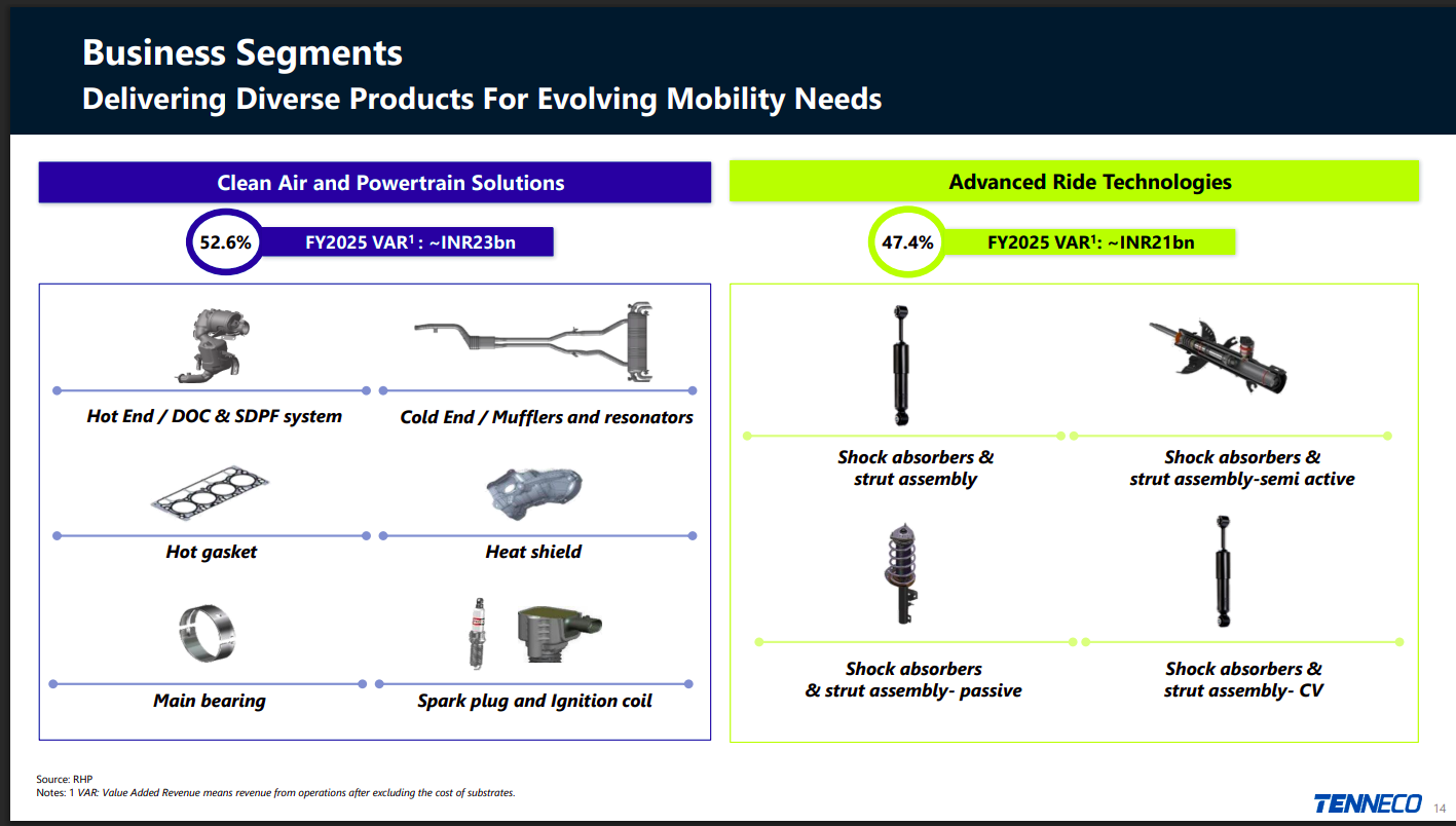 Revenue is split between Clean Air & Powertrain Solutions (52.6%, ~₹23 bn VAR) and Advanced Ride Technologies (47.4%, ~₹21 bn VAR). The portfolio spans emission systems, mufflers, bearings, spark plugs, and a wide range of shock absorbers and strut assemblies.