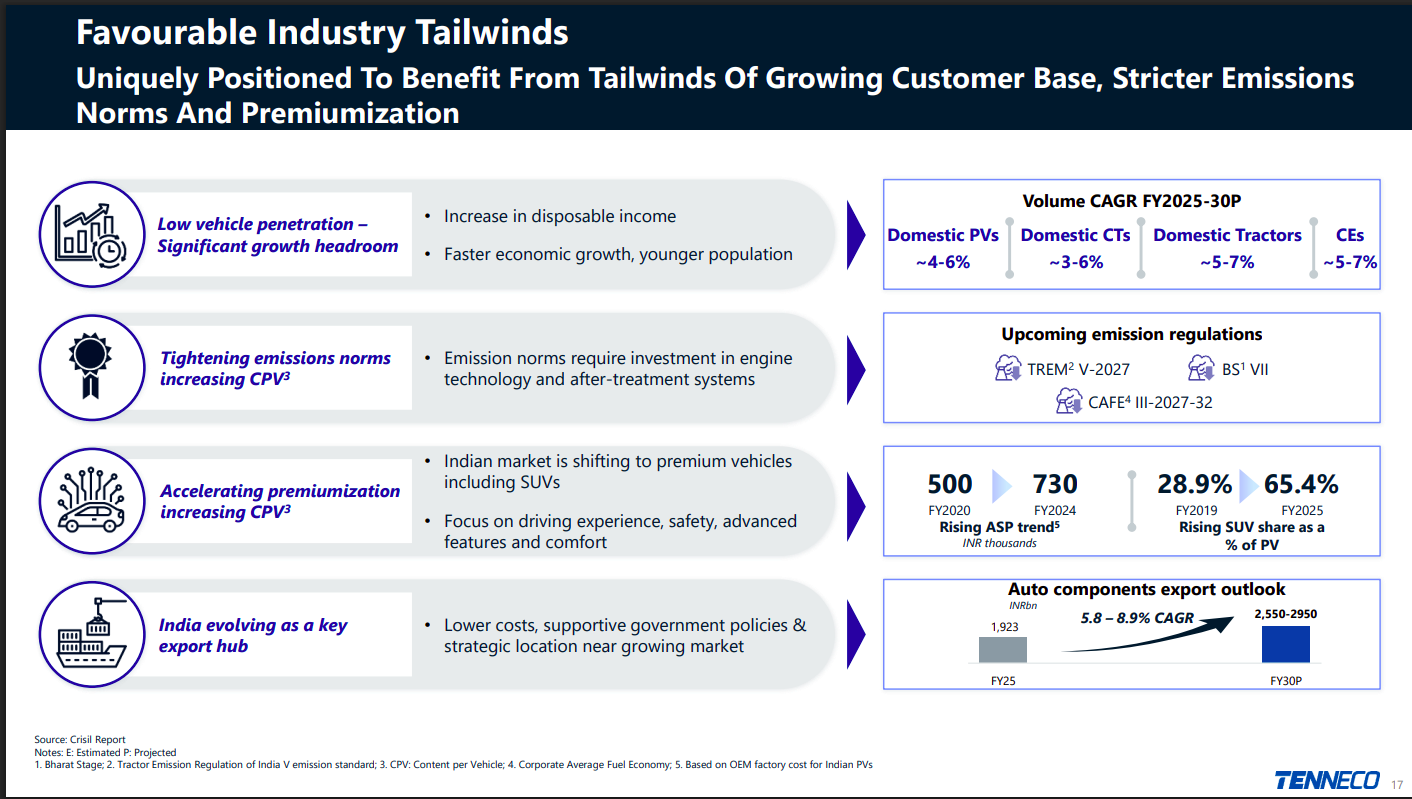 Tenneco Clean Air India Ltd. (TCAIL), founded in 1979 and part of U.S.-based Tenneco Group, designs and manufactures clean air, powertrain, and suspension solutions for Indian and global OEMs. It leads in CT, OH, and PV segments and exports across major global markets.