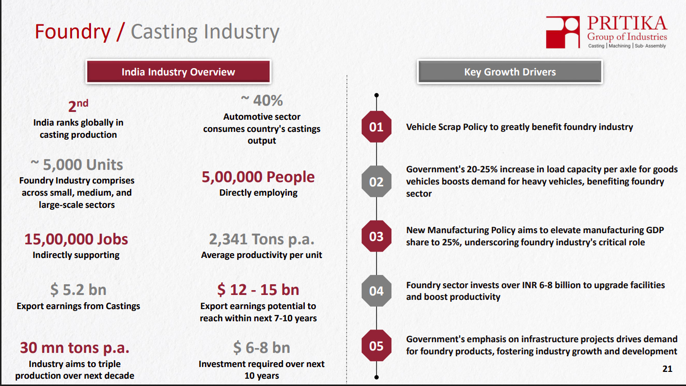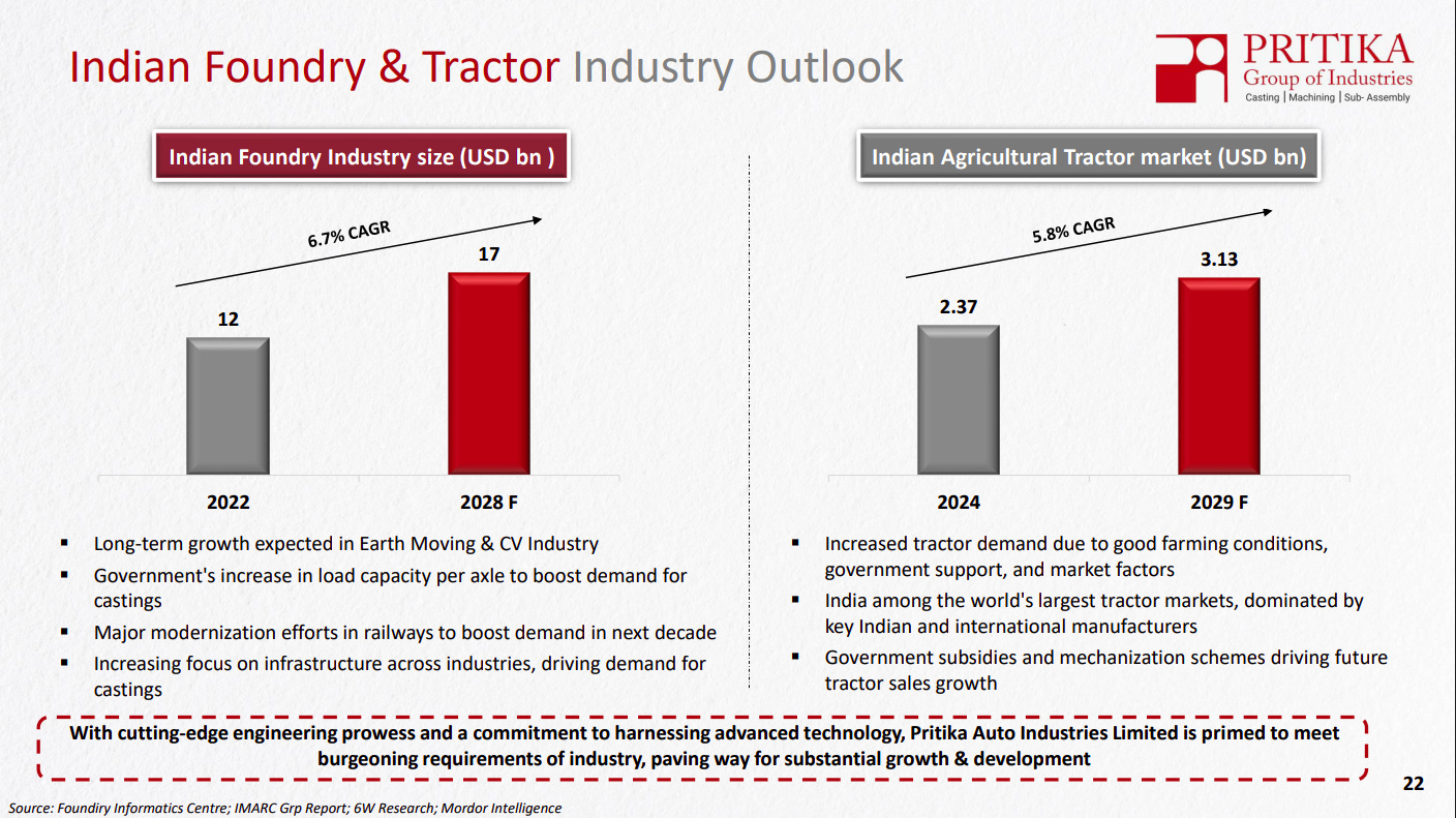 The Indian foundry industry is projected to grow from USD 12 bn in 2022 to USD 17 bn by 2028 (6.7% CAGR), supported by infrastructure push, rail modernization, and higher axle load norms. The tractor market is expected to rise from USD 2.37 bn in 2024 to USD 3.13 bn by 2029 (5.8% CAGR), driven by favorable farm conditions, subsidies, and mechanization trends.