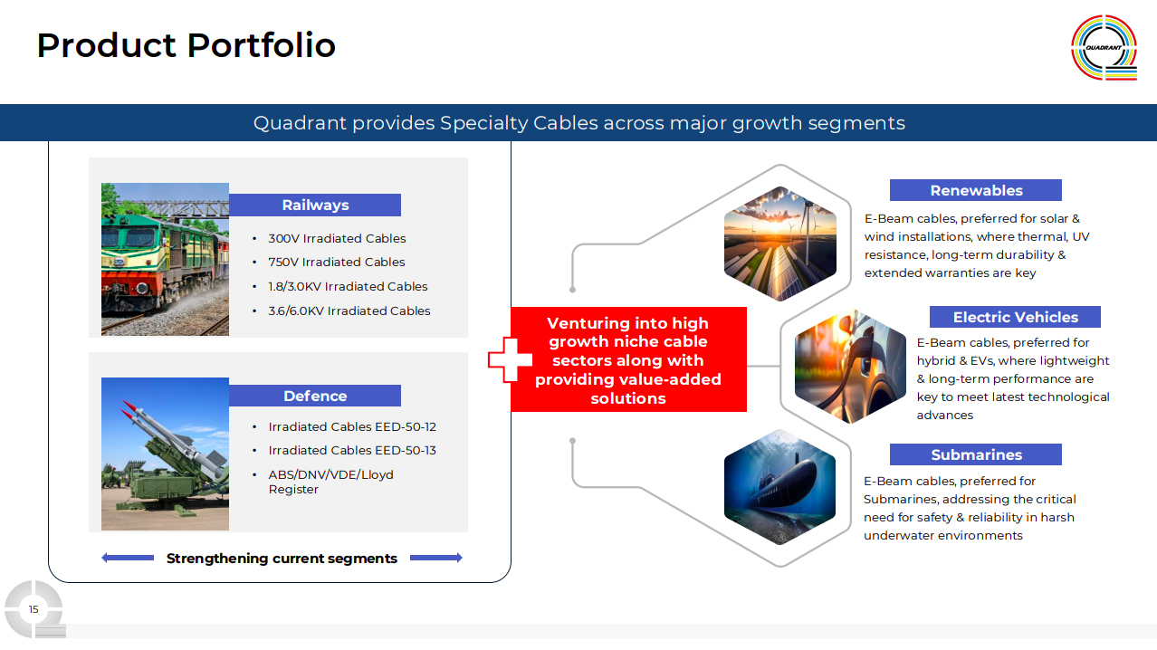 Quadrant serves core segments like Railways and Defence while expanding into high-growth niches such as Renewables, EVs, and Submarines.