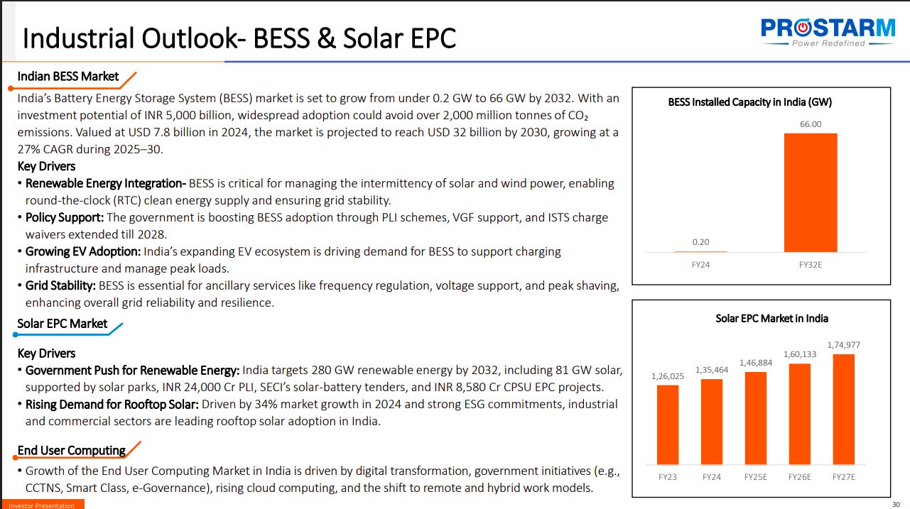 India’s BESS market is set for explosive growth, scaling from ~0.2 GW to 66 GW by 2032, driven by renewable integration, policy support, EV adoption, and grid stability needs. Solar EPC demand remains strong, supported by India’s 280 GW renewable target, rooftop solar expansion, and sustained government capex.