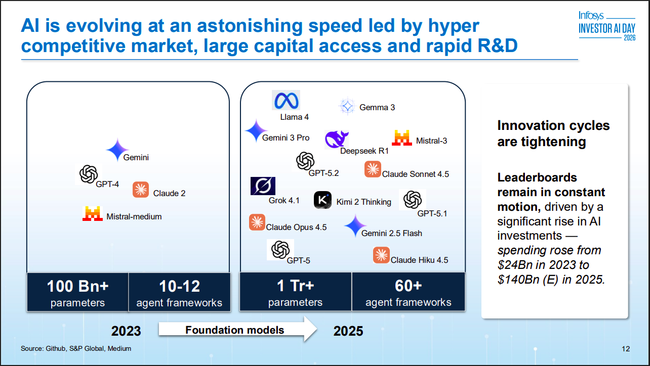 AI innovation has accelerated dramatically between 2023 and 2025, with model sizes expanding from ~100B+ parameters to 1T+ and agent frameworks rising from 10–12 to 60+. Rapid R&D, intense competition, and capital inflows are compressing innovation cycles, with AI spending projected to surge from $24Bn (2023) to ~$140Bn by 2025E.