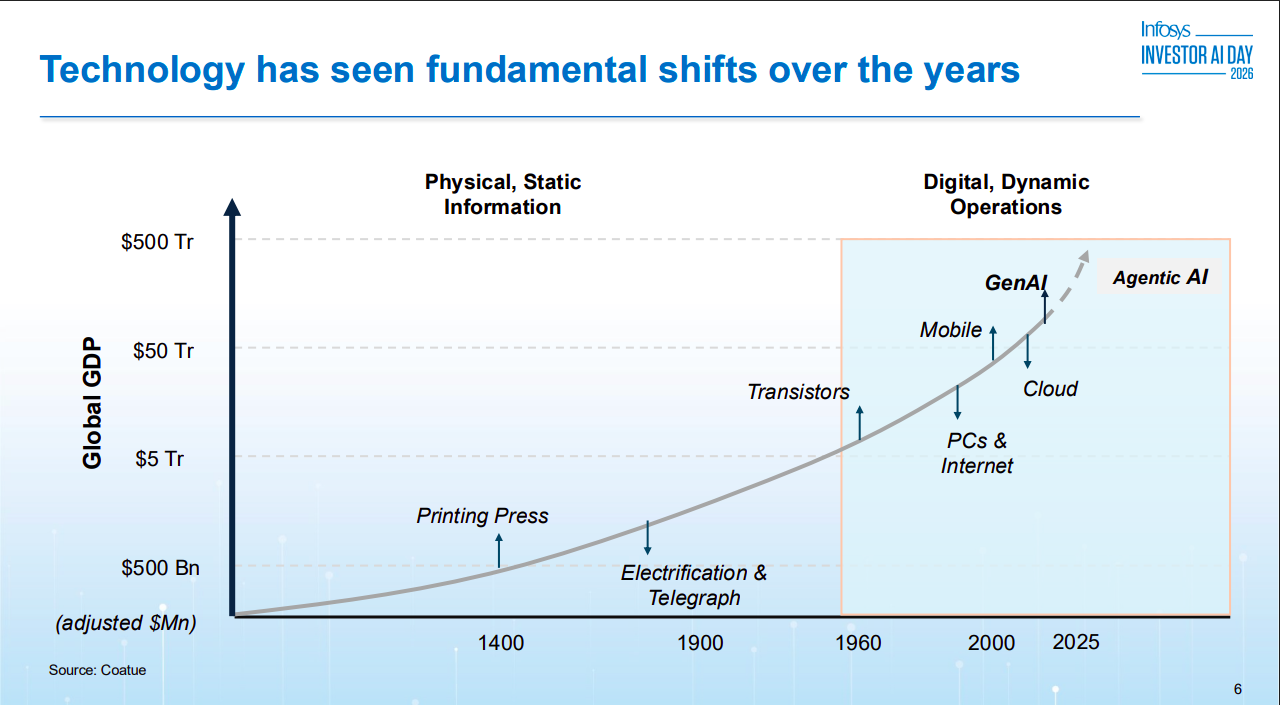 Technology waves—from the printing press to electrification, PCs, cloud, GenAI, and now agentic AI—have continuously expanded economic output. The shift from physical/static systems to digital/dynamic operations is accelerating GDP impact in the modern era.