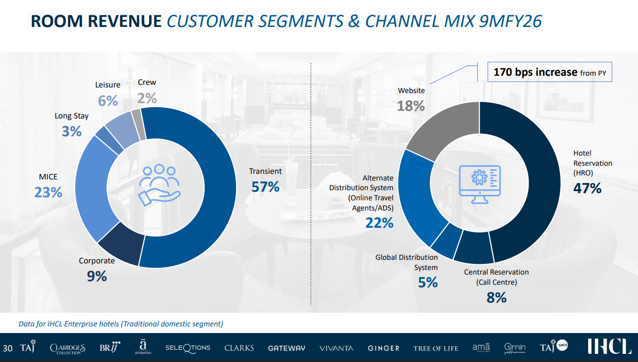 Indian Hotels gets most of its room revenue from transient guests at 57%, followed by MICE at 23%, corporate at 9%, leisure at 6%, long stay at 3%, and crew at 2%. On the distribution side, direct bookings through the hotel reservation system contribute 47%, while the company’s website accounts for 18%, up 170 basis points from the previous year. Online travel agents and alternative distribution systems make up 22%, with the remaining coming from global distribution systems and call centers. The growing share of direct bookings, especially through the website, is positive as it means lower commission costs and better margins for the company.