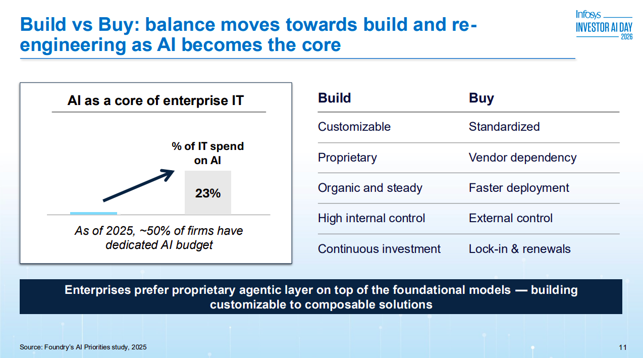 AI is becoming central to enterprise IT, now accounting for ~23% of IT spend, with ~50% of firms allocating dedicated AI budgets. The balance is shifting toward “Build” models for customization, control, and proprietary advantage rather than standardized vendor-led “Buy” solutions.