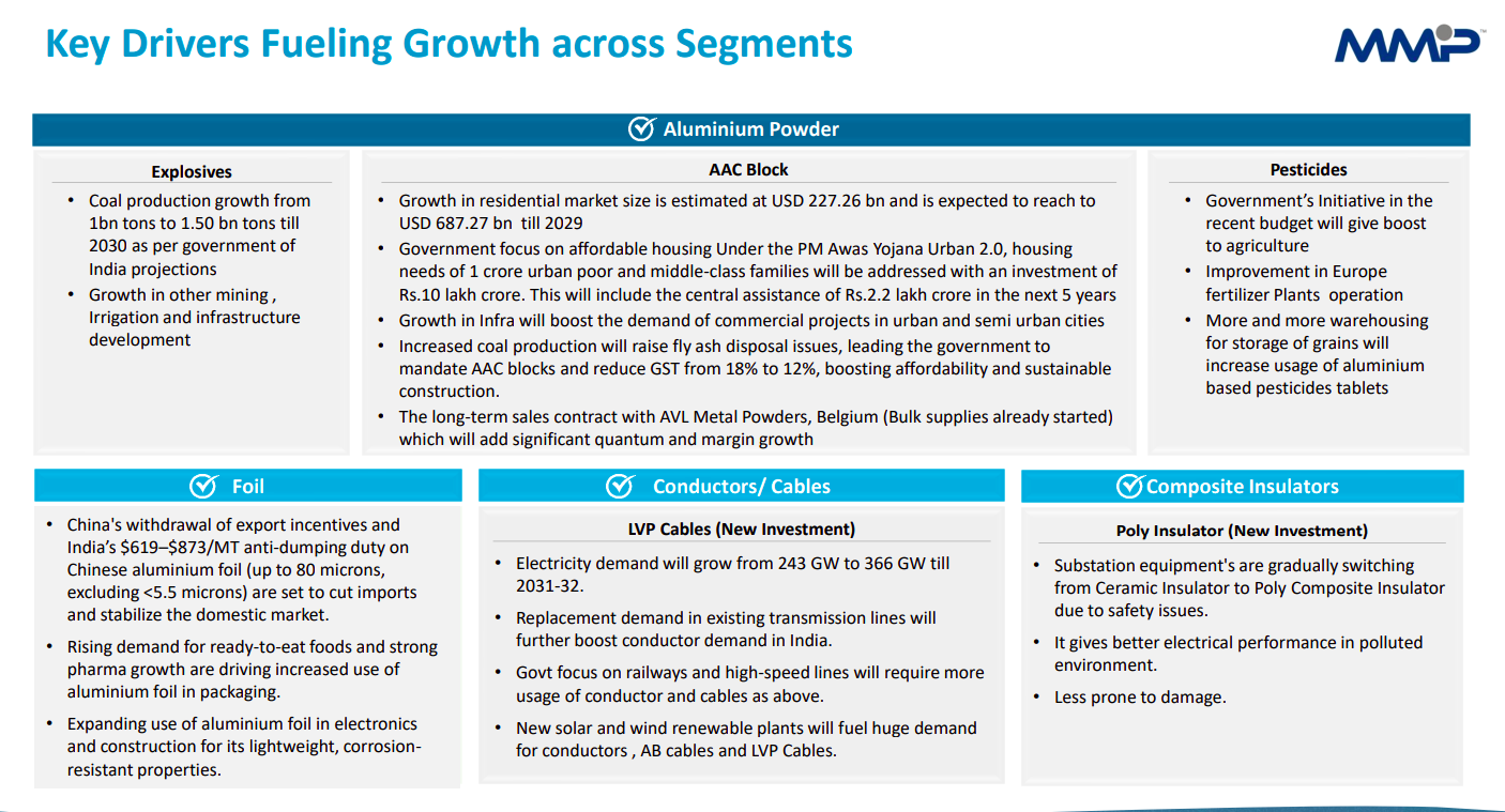 The slide outlines demand triggers across explosives, AAC blocks, pesticides, foil, conductors/cables, and composite insulators. Infrastructure push, affordable housing, renewable energy, anti-dumping measures, and power transmission investments are expected to drive sustained volume and margin growth across aluminium-based applications.