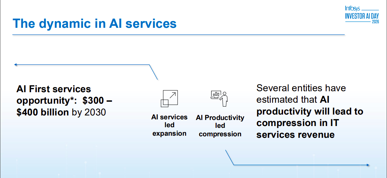 AI-first services are estimated to create a $300–400 billion opportunity by 2030, driven by AI-led expansion. However, rising AI productivity may also compress traditional IT services revenue, creating a dual impact of growth and margin pressure.