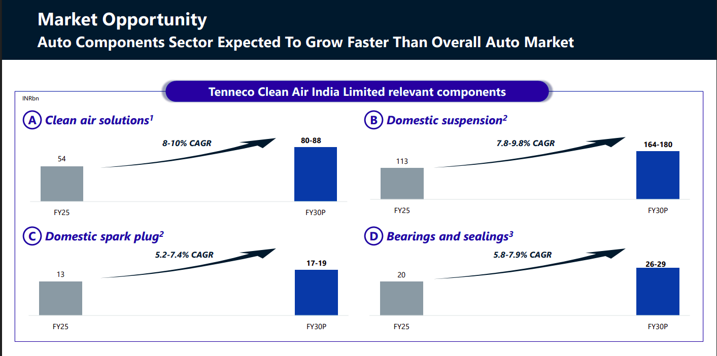 Key component categories are expected to outpace overall auto growth, with Clean Air Solutions and Domestic Suspension projected at ~8–10% CAGR through FY30. Bearings, sealings, and spark plugs also show steady mid-to-high single-digit growth visibility.