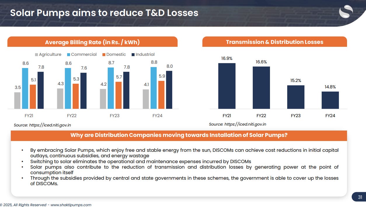 Electricity distribution companies are pushing for solar pumps to reduce transmission and distribution losses, which have fallen from 16.9% in FY21 to 14.8% in FY24. Average billing rates have been rising across all consumer categories, with agriculture at Rs. 4.1 per kWh, commercial at Rs. 8.8 per kWh, domestic at Rs. 5.9 per kWh, and industrial at Rs. 8.0 per kWh in FY24. Solar pumps offer a win-win as they cut capital outlays, ongoing subsidies, and energy wastage for distribution companies, while generating power at the point of use and eliminating maintenance costs. The government is able to cover distribution company losses through subsidies in these solar schemes, making the transition economically viable.