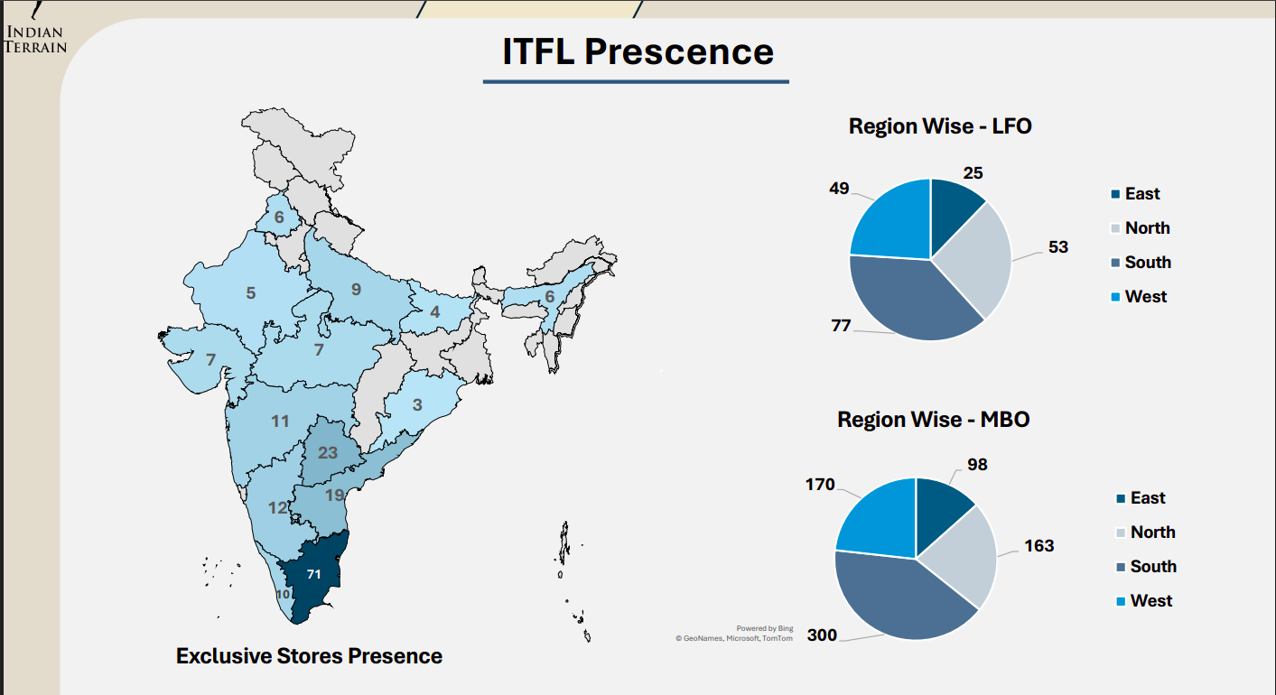 ITFL has a strong pan-India footprint with a higher concentration of exclusive stores in South and West India. Region-wise, South leads both LFO and MBO formats, followed by North and West, while East has a relatively smaller presence.
