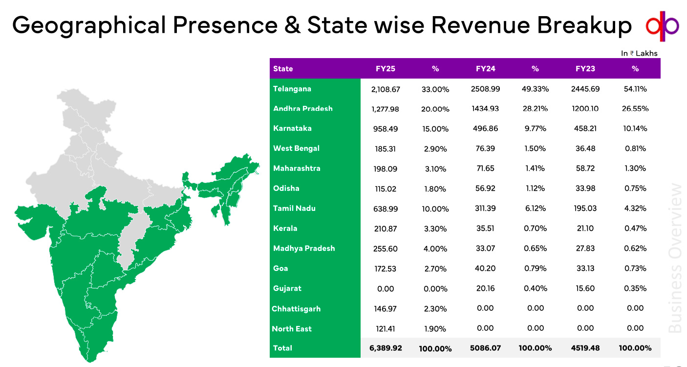 The company derives a majority of its FY25 revenue from Telangana (33%) and Andhra Pradesh (20%), with Karnataka (15%) and Tamil Nadu (10%) as other key contributors. Revenue has diversified compared to FY24–FY23, with rising contributions from Maharashtra, Kerala, MP, and newer regions like Chhattisgarh and North East. Total revenue increased to ₹6,389.9 lakhs in FY25 from ₹5,086.1 lakhs in FY24 and ₹4,519.5 lakhs in FY23.