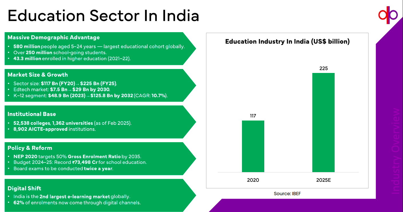 India’s education sector has expanded from $117 billion (FY20) to an estimated $225 billion (FY25E), supported by strong demographics and policy reforms like NEP 2020. The country has over 580 million youth (5–24 years), 52,000+ colleges, and growing digital adoption, with 62% of enrollments through online channels. Edtech and K-12 segments are witnessing strong long-term growth momentum.