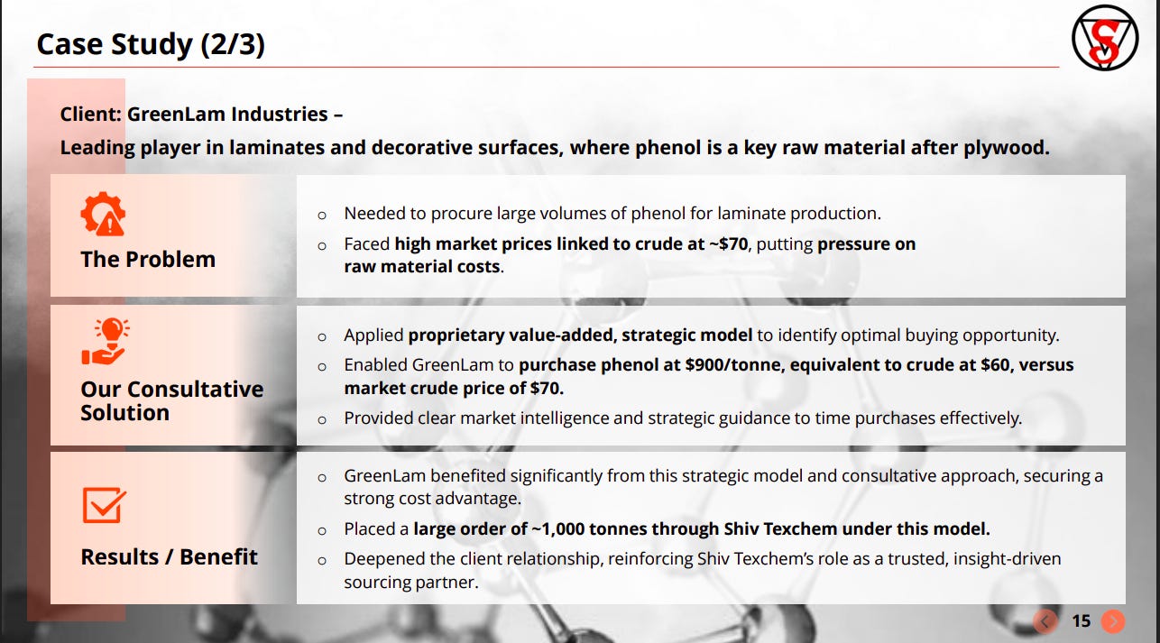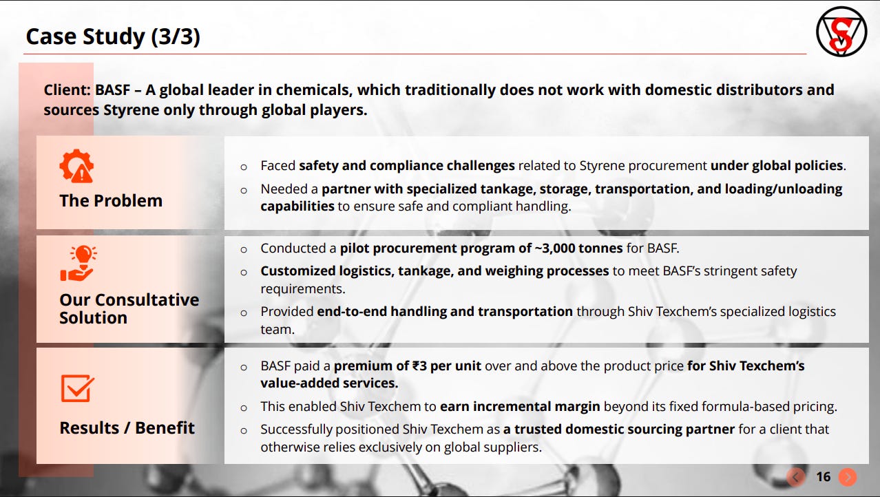 For a global major like BASF, Shiv Texchem delivered specialized logistics and compliance-led sourcing, enabling safe handling of styrene. This led to premium pricing and higher margins, showcasing value-added capabilities beyond trading.