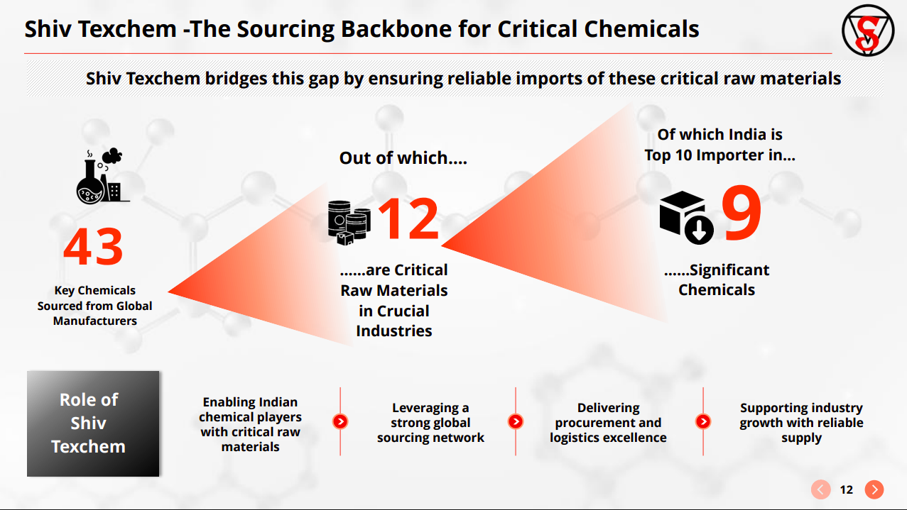 Shiv Texchem bridges India’s supply gap by sourcing 43 key chemicals globally, including 12 critical raw materials, with India being a top importer in several. The model is built on global sourcing, logistics execution, and supply reliability.