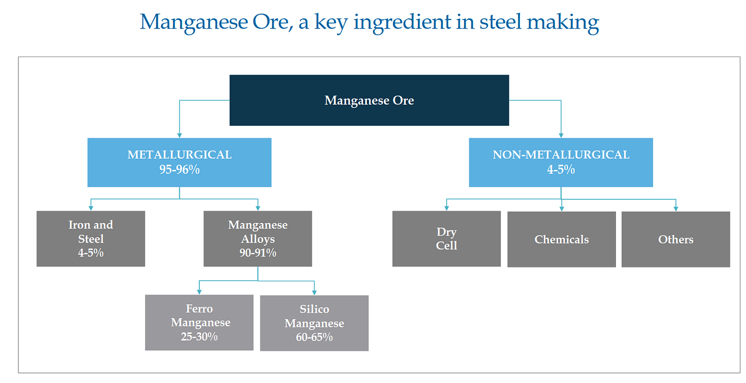 ~95–96% of manganese demand is metallurgical (steel & alloys), with ferro and silico manganese forming the bulk of consumption. This makes the sector a direct proxy on steel cycle and infrastructure demand.