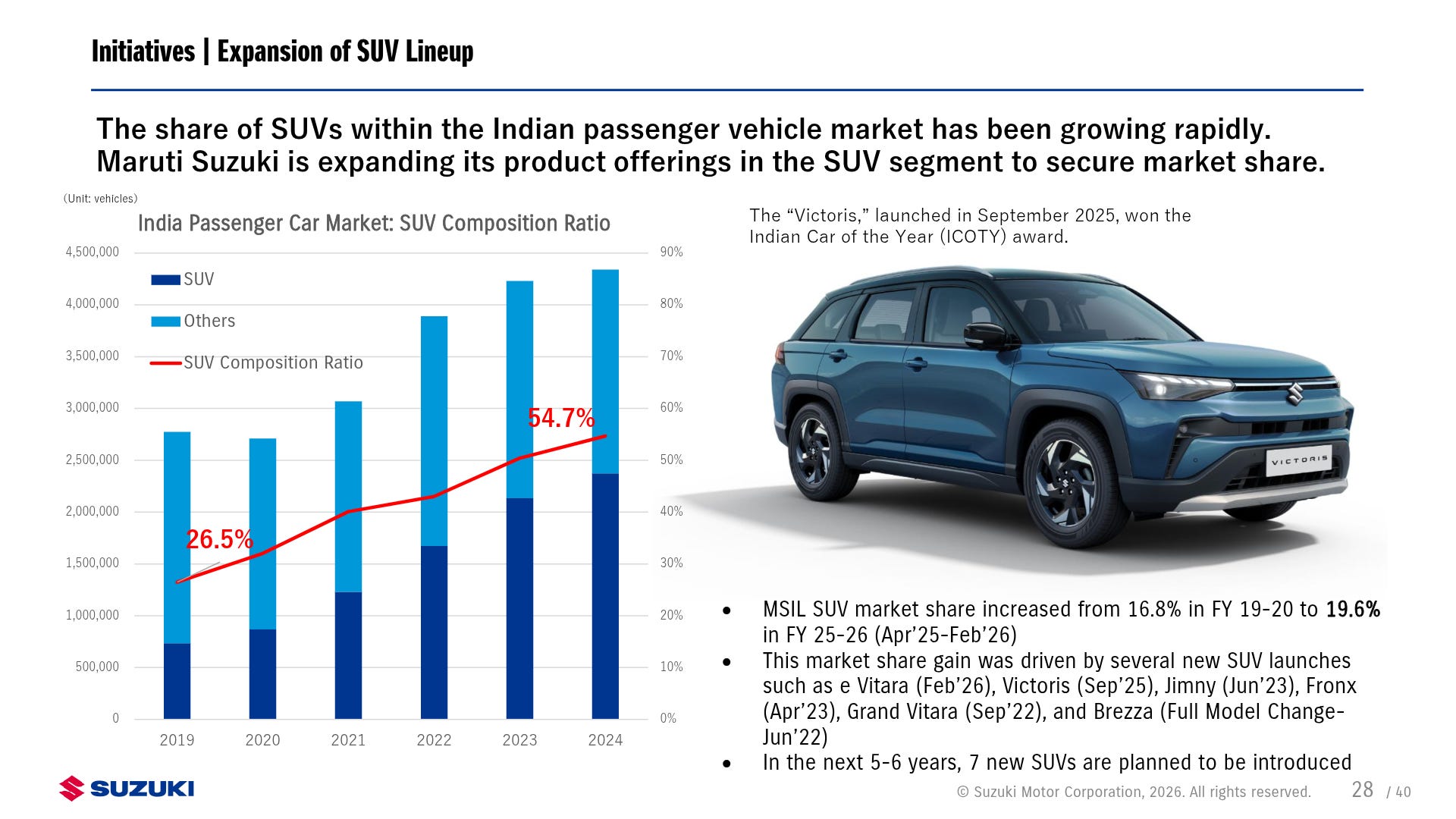 The rise of SUV market share to nearly 55% reflects a permanent shift toward premium lifestyle choices among Indian buyers. Capturing this high-margin segment is critical to protecting long-term returns as the legacy small-car market matures.