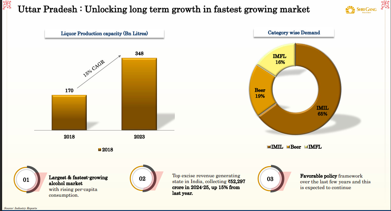 UP is India’s largest and fastest-growing liquor market, with production capacity growing at ~15% CAGR and strong excise-led policy support. IMIL dominates (~65% share), but premiumization (IMFL + beer) is steadily rising, creating a multi-layer demand expansion opportunity.