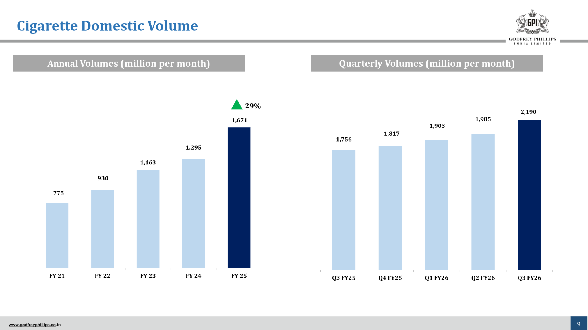 Monthly cigarette volumes reached 2.1 billion, a massive structural scale-up from 775 million five years ago. This growth confirms successful brand penetration and a shift toward organized tobacco.