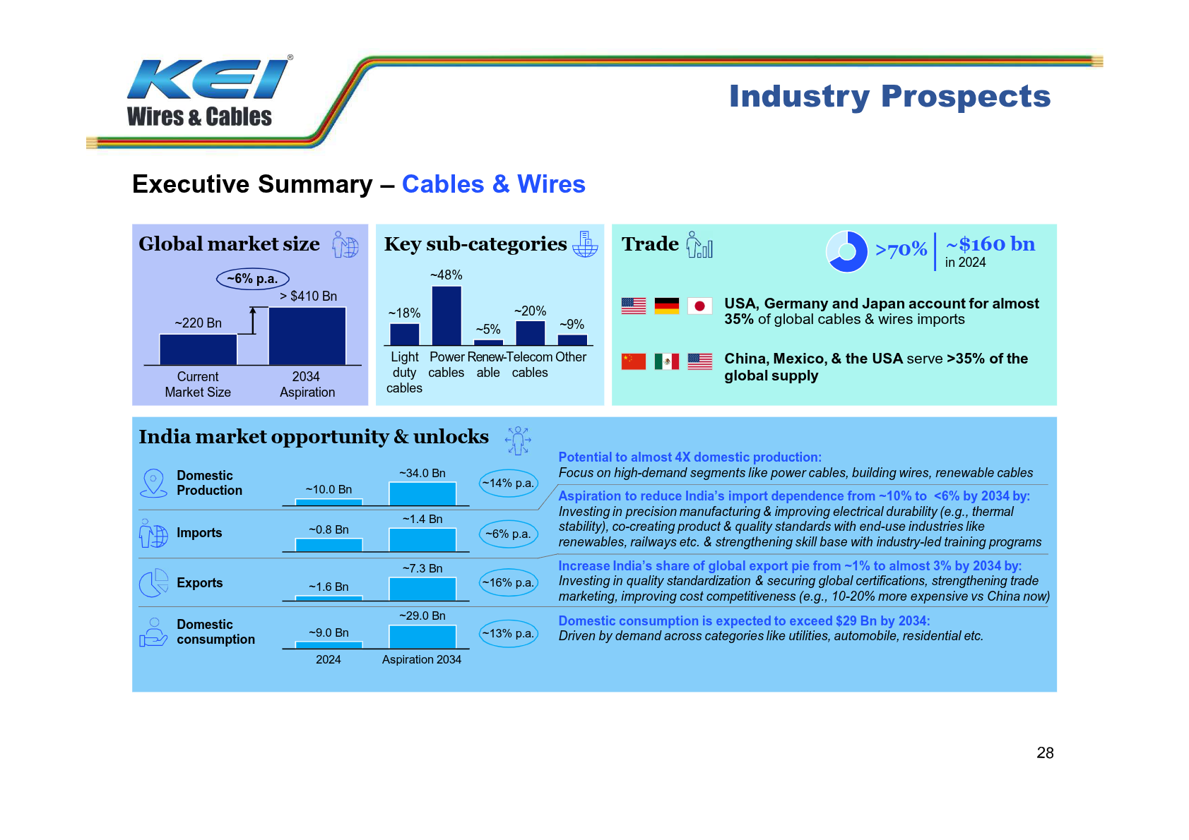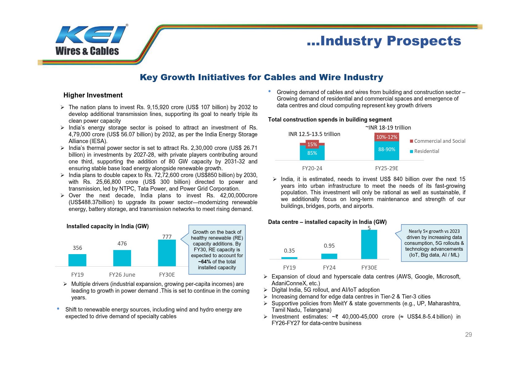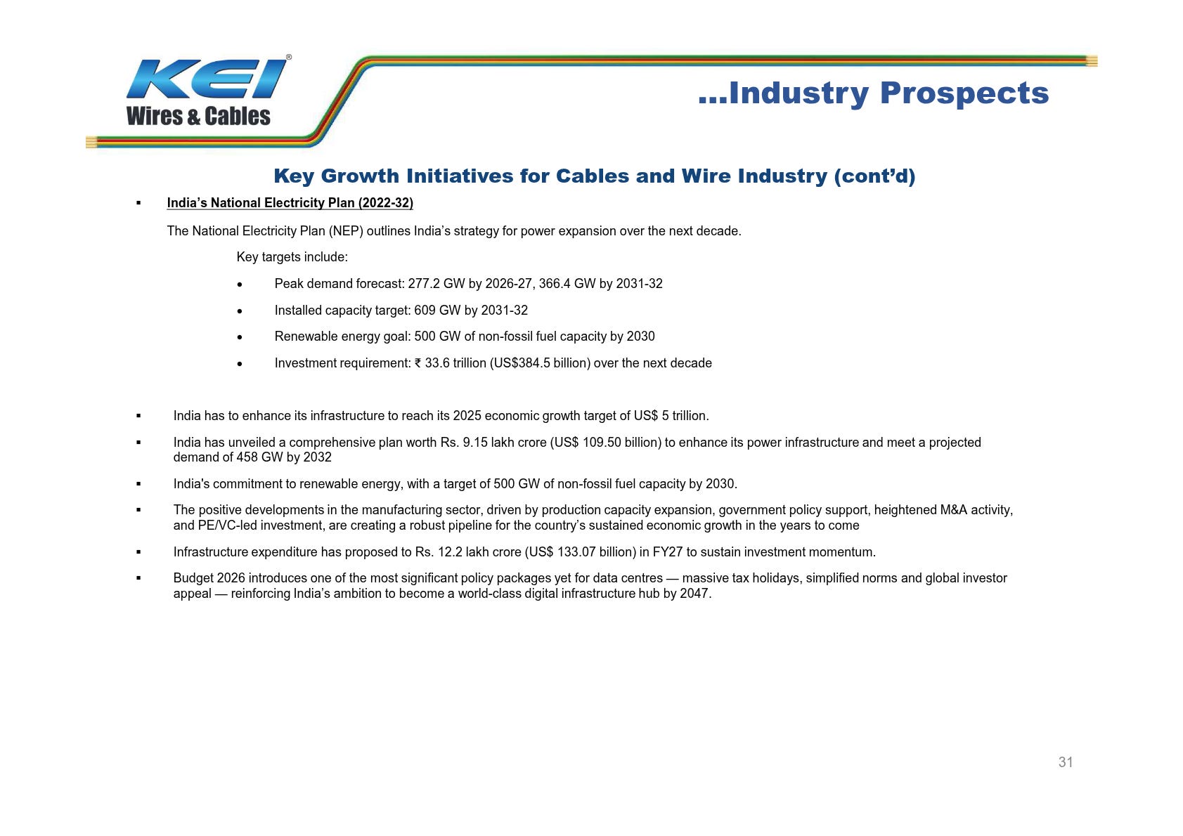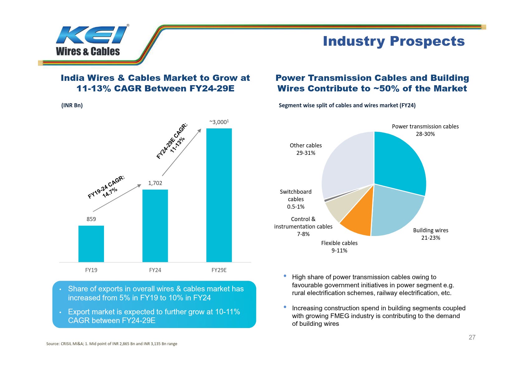 KEI Wires & Cables is poised to benefit from robust industry growth, driven by power transmission and building wires, which account for half the market. Government initiatives and rising demand from construction and renewable energy sectors ensure strong long-term prospects.