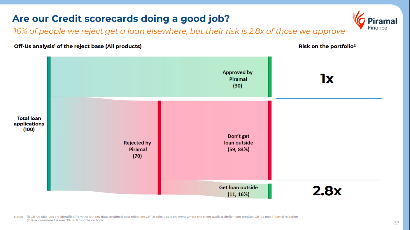 Piramal’s credit scorecards appear effective as only 16% of rejected applicants secure loans elsewhere, and those borrowers show 2.8x higher risk than approved customers. This indicates the company’s underwriting filters are successfully identifying and avoiding higher-risk borrowers.