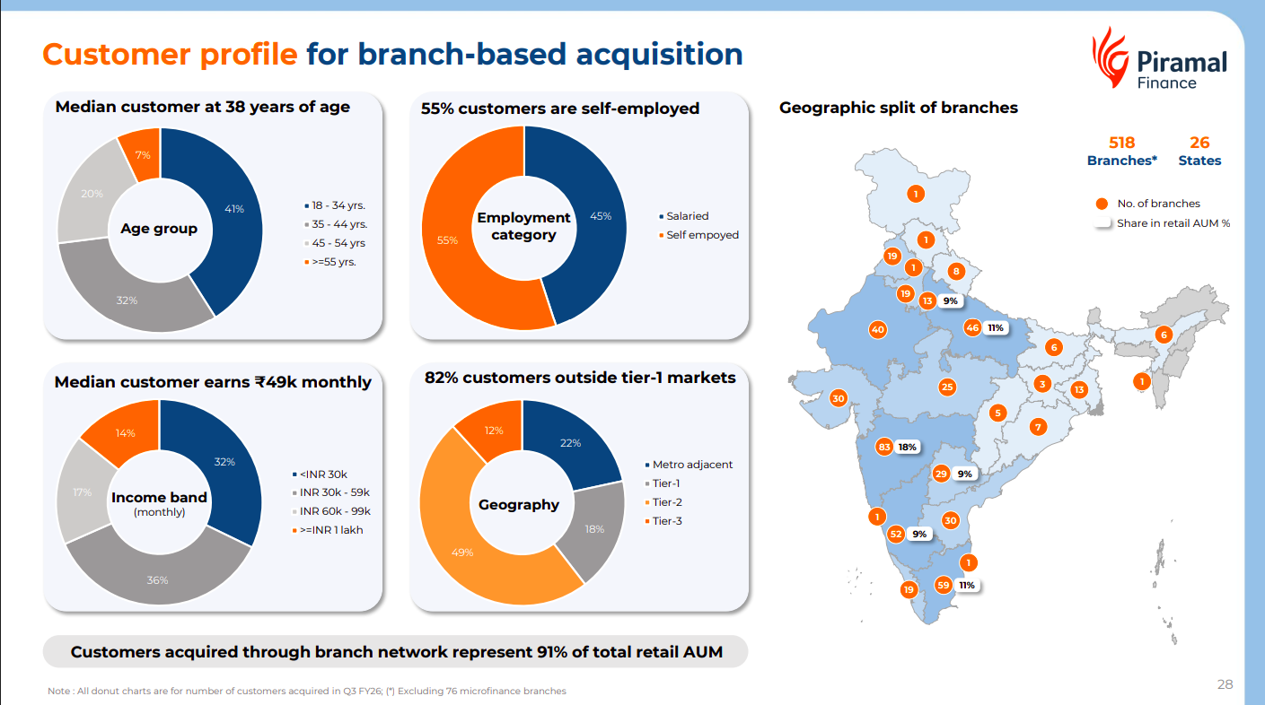 The typical Piramal customer is around 38 years old, earning ~₹49K monthly, with 55% self-employed borrowers. About 82% of customers come from non-tier-1 markets, highlighting the company’s strong focus on semi-urban and emerging markets through its 518-branch network across 26 states.