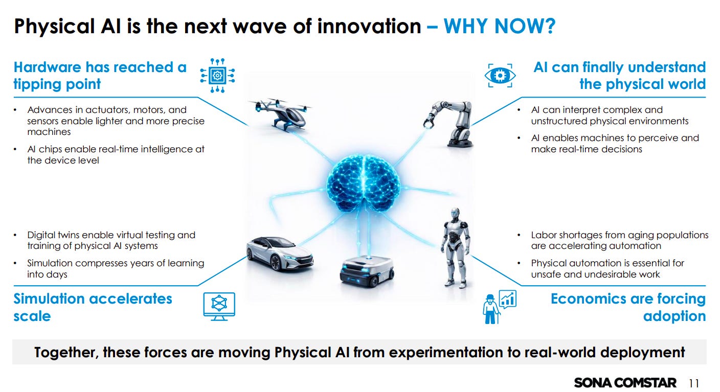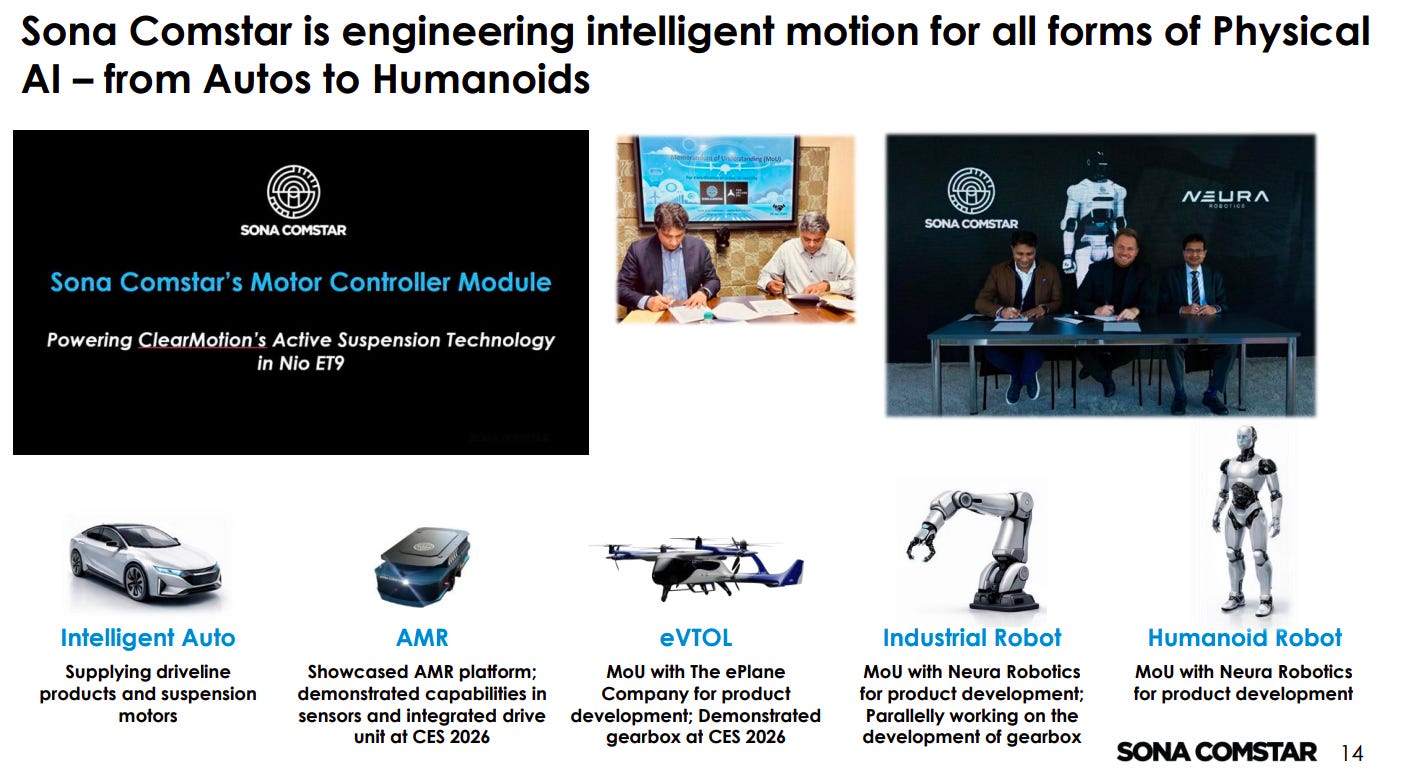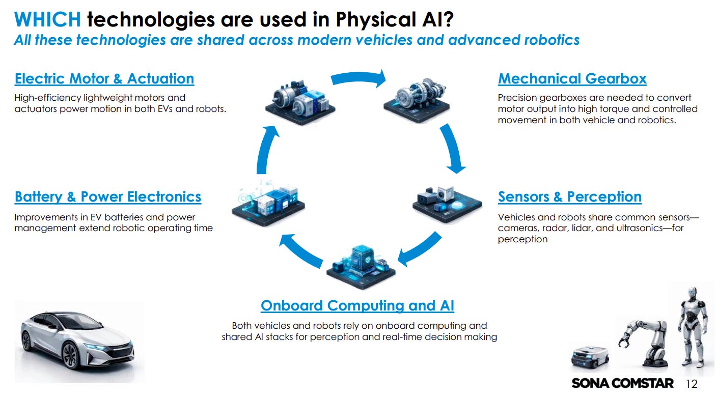 Sona Comstar is positioning itself as a motion and drivetrain enabler across multiple Physical AI applications, including EVs, drones, robots, and humanoids. The company is expanding through partnerships, product development, and showcasing capabilities (e.g., CES 2026).