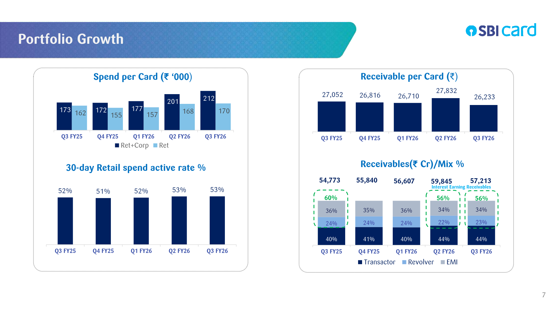 A stable revolver mix alongside rising transactor shares indicates card usage is shifting toward convenience rather than borrowing. While this reduces credit risk, it increases reliance on fee-based income to offset capped interest upside.