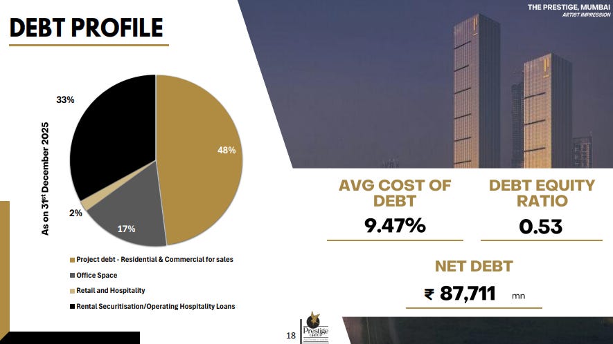 Debt is largely concentrated in project-related borrowings, making up nearly half of the total, with the remainder spread across office assets and rental/hospitality loans. The average cost of debt stands at 9.47%, with a debt-to-equity ratio of 0.53 and net debt at ₹87,711 million.