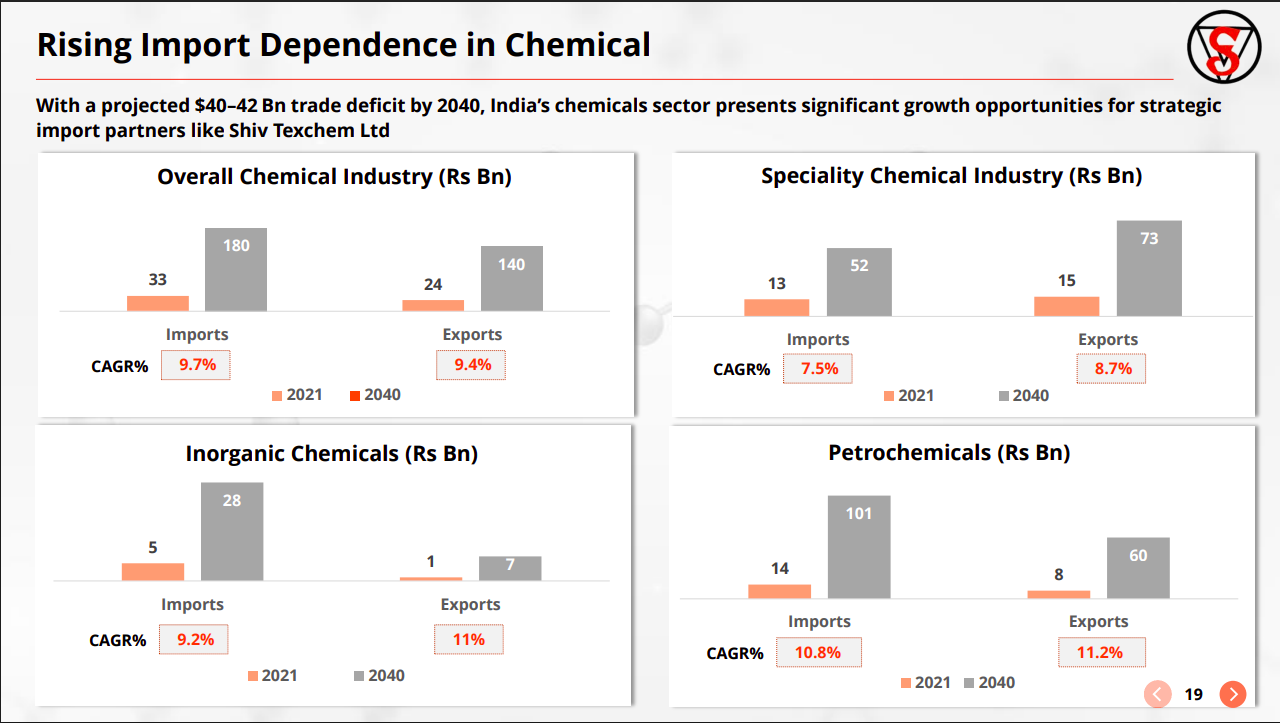India’s chemical sector is expected to see significant growth in imports (~9–11% CAGR), with a widening trade deficit. This structurally increases the role of import-focused sourcing intermediaries like Shiv Texchem.
