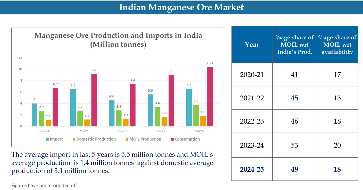 India remains structurally import-dependent (~5.5 MT average imports) despite steady domestic production growth. MOIL dominates domestic supply (~45–53% share), but the gap between consumption and production highlights a persistent supply deficit.