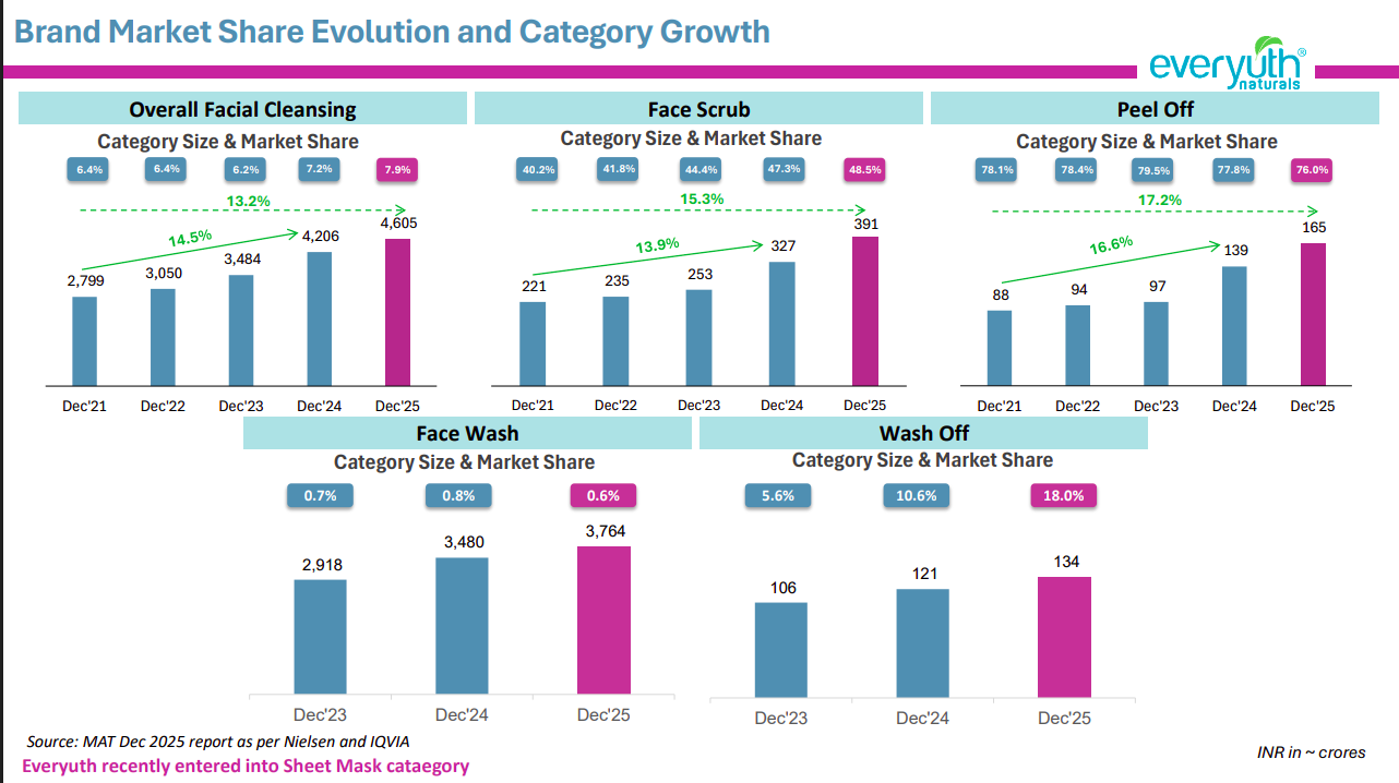 Everyuth continues to lead in high-growth niches like scrubs (48.5%) and peel-offs (76%), while scaling presence in overall facial cleansing (~7.9% share). Categories are expanding at 13–17% CAGR, indicating strong tailwinds in naturals-led skincare.