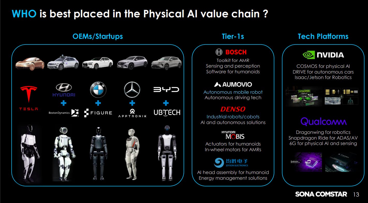 The Physical AI ecosystem spans OEMs/startups (Tesla, BYD, humanoid firms), Tier-1 suppliers (Bosch, Denso), and tech platforms (NVIDIA, Qualcomm). Value creation is distributed across hardware, software, and systems integration, with multiple players competing across layers.