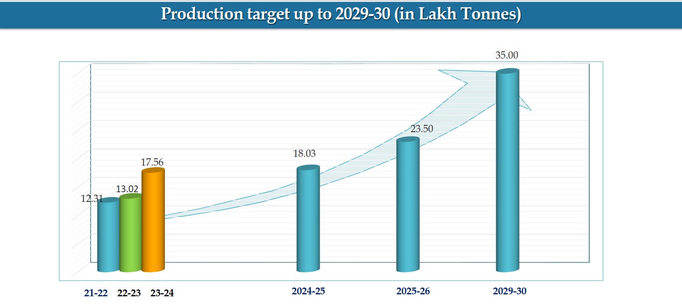 India’s manganese ore production is targeted to scale from ~12–18 lakh tonnes historically to 35 lakh tonnes by FY30, implying a strong ramp-up trajectory. This reflects capacity expansion and rising domestic demand visibility, likely driven by steel and alloy consumption.