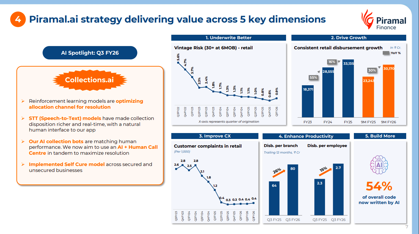 Piramal is integrating AI across underwriting, collections, customer experience, and productivity. Tools like Collections.ai, reinforcement learning models, and speech-to-text systems are improving resolution rates, reducing complaints, boosting disbursement productivity, and enabling AI to generate 54% of internal code.